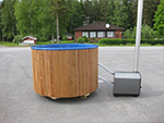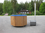 Kylpytynnyri 1200L ulkopuolisella merialumiinikamiinalla ja lasikuituisella sisäaltaalla jossa vielä muovipinnoite.